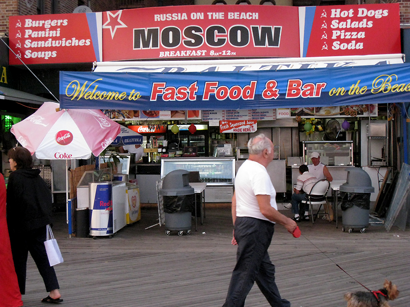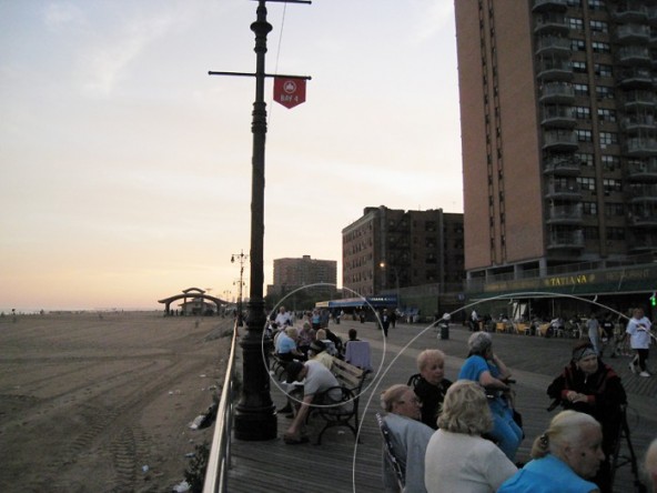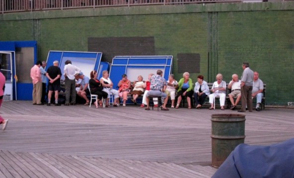 Benches used and extra chairs brought over for night-time chatting, by elderly folks of Russian community in Brighton Beach. At base of high rise towers, on the boardwalk facing the beach.