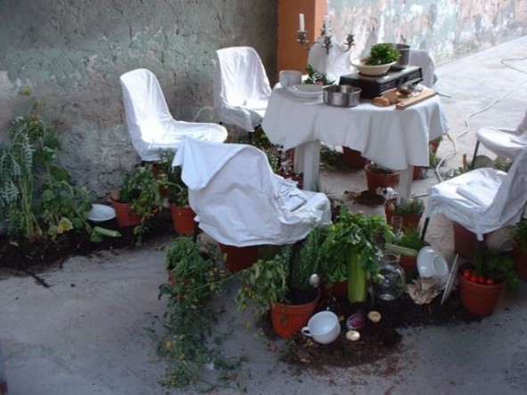 LIVE DINING is a planting, harvesting, preparing, composting, cooking, dining PERFORMANCE, a CONCEPT, with "Live Dining-Room Kitchen" installation, CHANGING, ADAPTING & EVOLVING with different contexts. Bringing and/or VALIDATING "wild" plants, polyculture agriculture, foraging in needed places, to address issues related to food, medicine, culture, non-monetary exchange, in contexts of diversity of people, plants, wilderness, domestication & community.