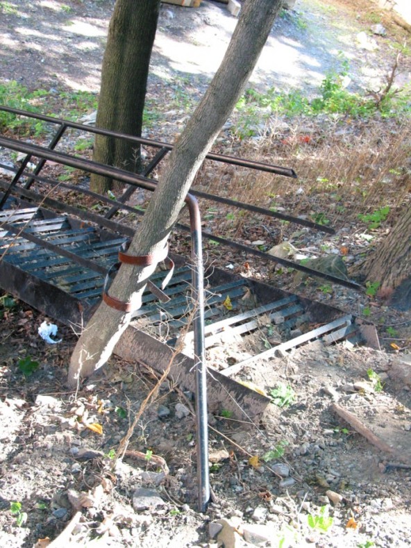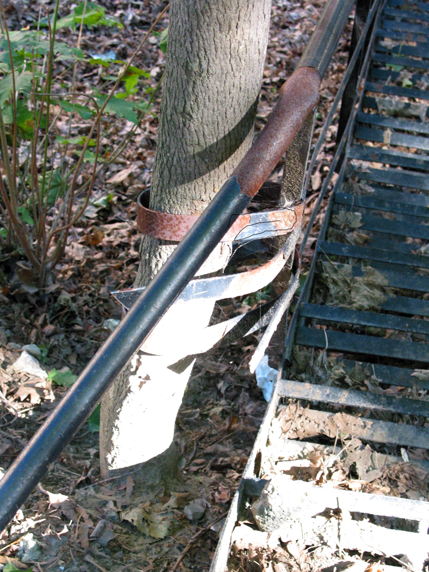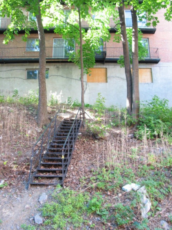 Improvised staircase hooked and stabilized to an existing tree. Located on the Mont Royal, close to an existing hospital. Unknown actor. Existing staircase possibly found and originating from surrounding abandonned buildings with similar black staircases and balcony railways.