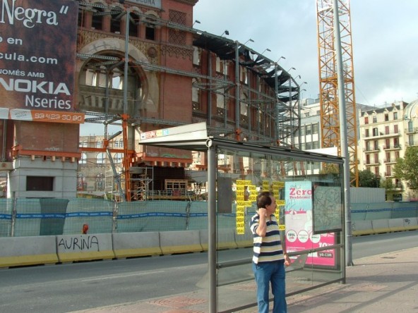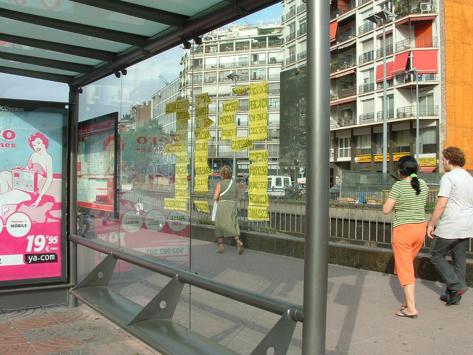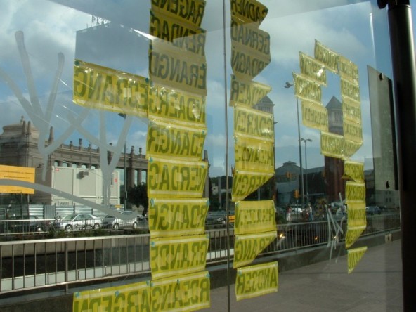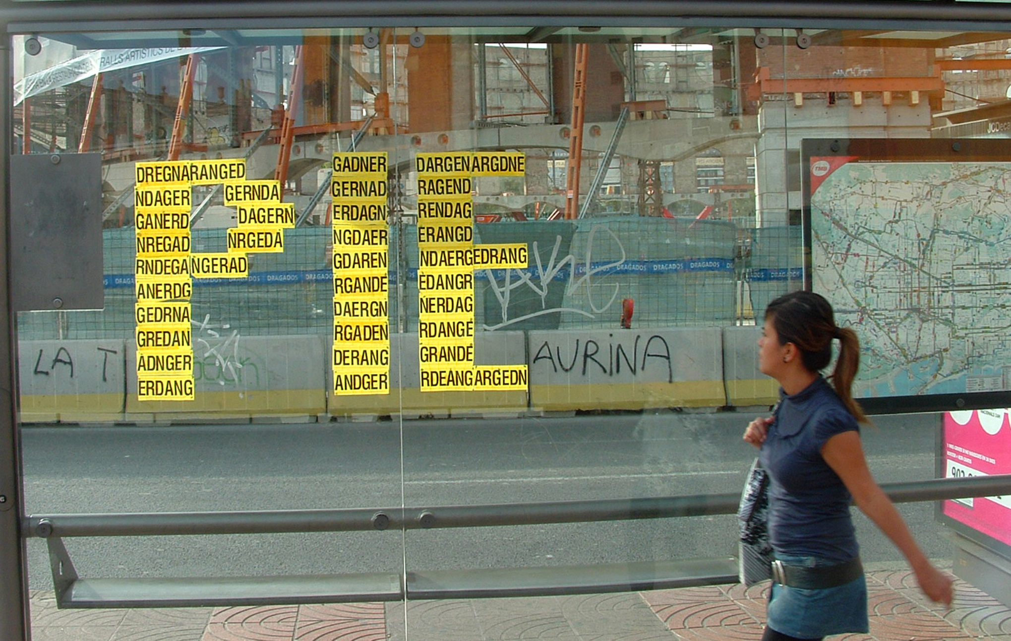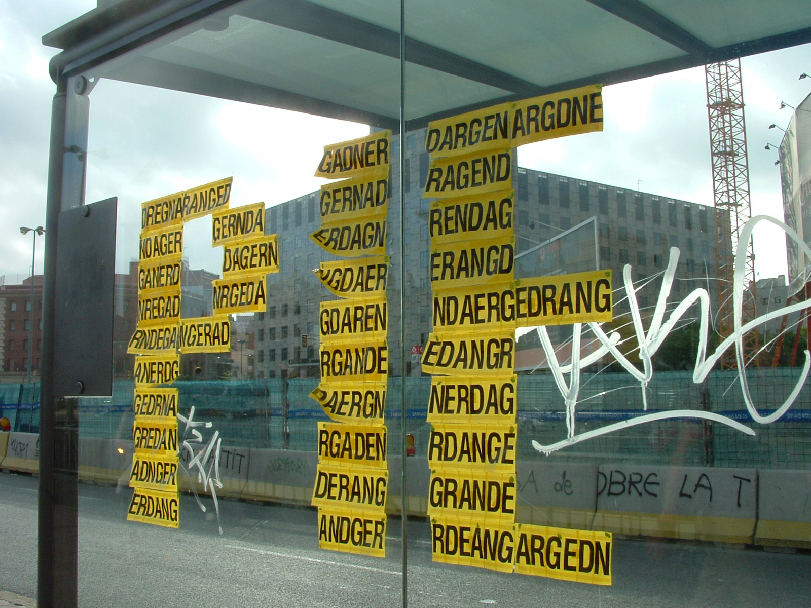 I started this project during my residency at the Darling Foundry in the winter of 2006 in Montreal, Canada. I made 100 anagrams of Danger and I started to installed them in different cities. The rule of the game is to find words that mean something in Spanish, French and eventually in English. The word PIE means FOOT in spanish, MAGPIE in French and PIE (cake) in English. The location is the Plaza de Toros that was under construction, about to be transformed into a shopping center.