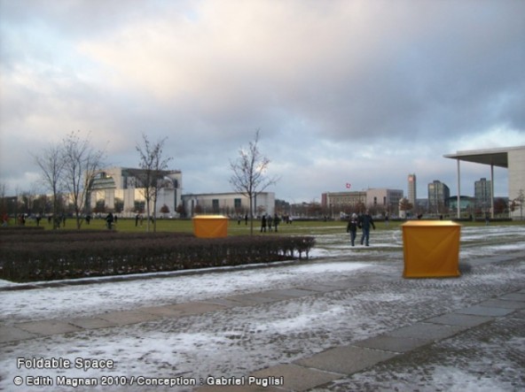 "The Foldable Space" is a low-cost system that enables mobility for people in various environments. One unit supplies space for one or several persons and one or several persons can move the unit, either by pushing it like a wheel or walking inside it or on top of it. His simple and light structures are easily moveable and manipulatable by their users. The visitor tries to construct his own experience of this space.