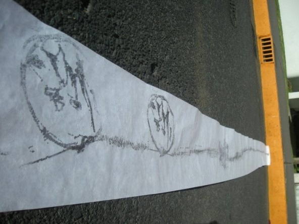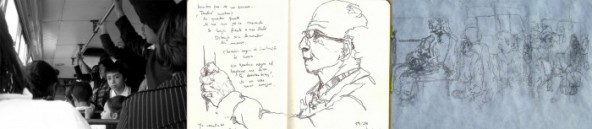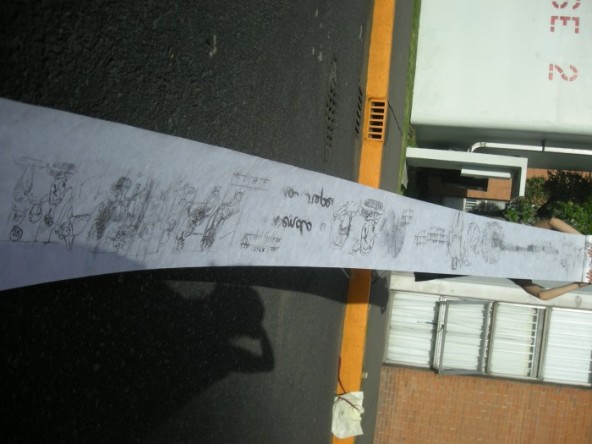 I began my project wondering how I could find creative moments in my everyday life (particularly on buses and in the subway) . I drew, took pictures and wrote while observing people and their surroundings. The main component of my work was completed on the street. A long strip of paper, 10 meters of drawings and transfer (using my sketches and writtings) was stuck in a public space as a kind of invasion. I tried to make people see something different on the way to their work. The drawings are of pedestrians, as we all are and while they observed my work they would walk, as I walked to do this project so that we would be reflected.