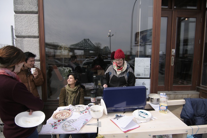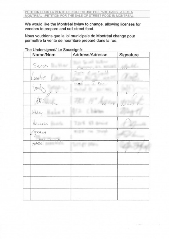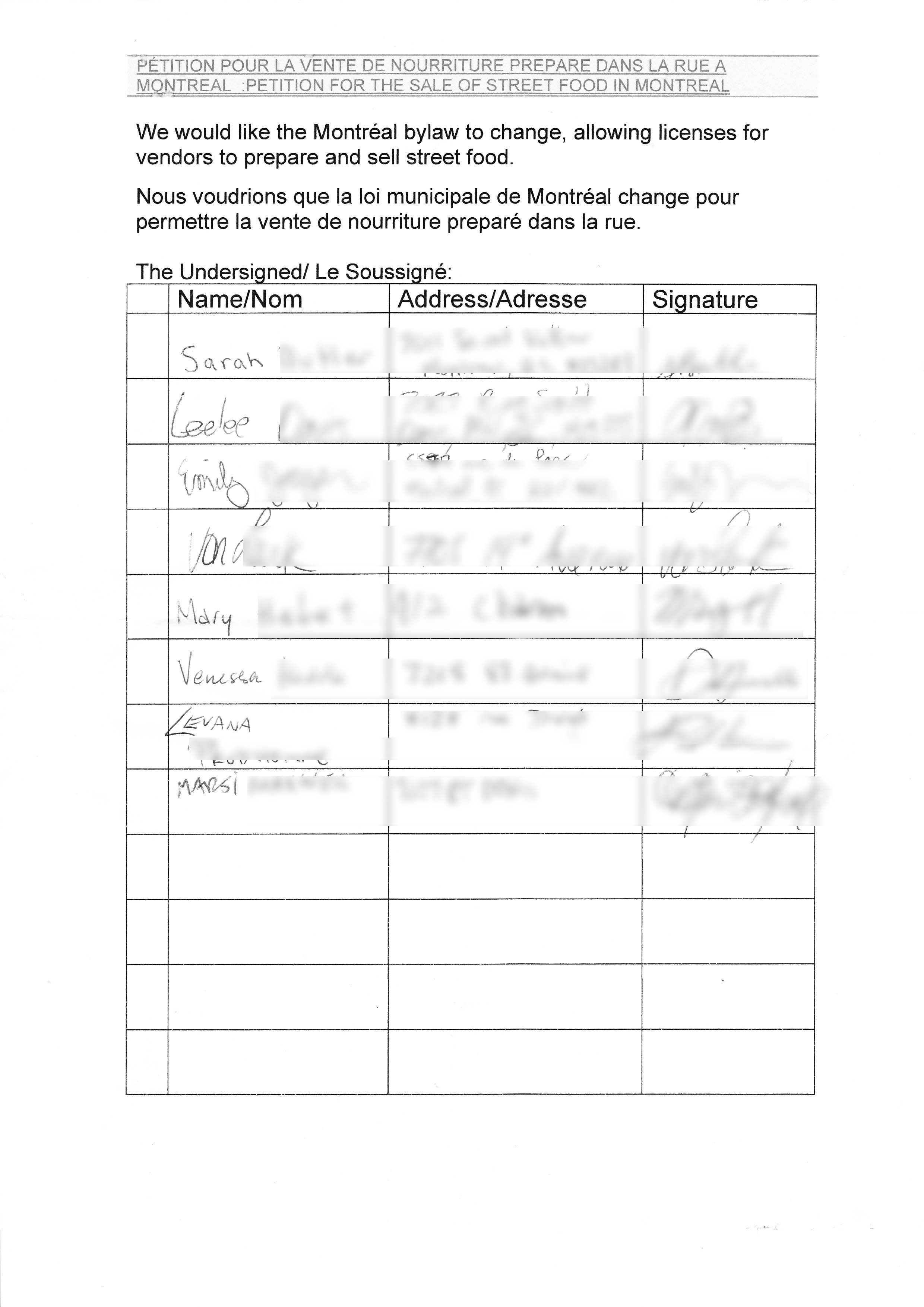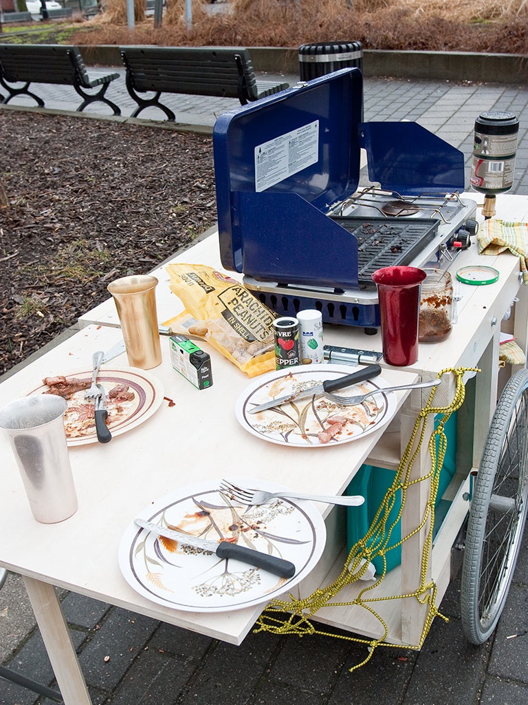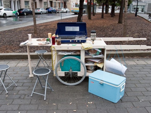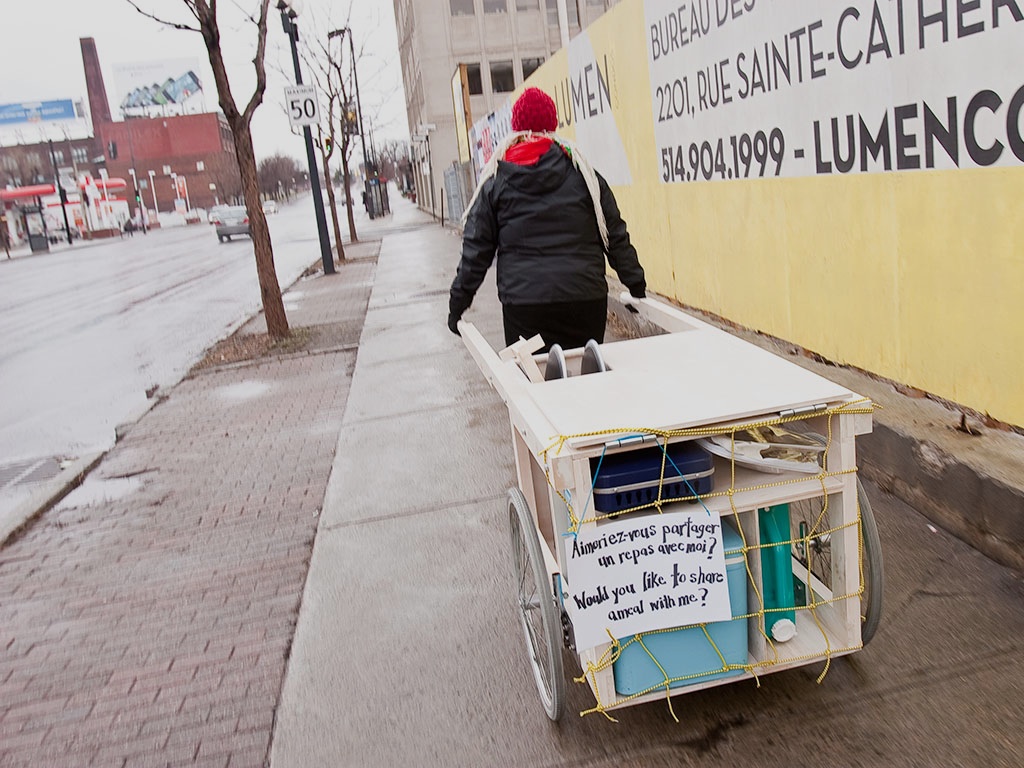 Since 1947 in Montreal the sale of street food has been forbidden. The authorities have continually explained it as necessary to protect the public from poor hygiene and to protect restaurants from competition. In other cities the ability to sell street food enables individuals from a lower socio-economic bracket and those who have immigrated an opportunity for a livelihood while also creating a diversity of cultural experiences. I pull my handmade mobile kitchen/dining room on the streets of Montreal and inviting people to have a meal with me. Through this act I hope to look at the street food experience as an opportunity for social engagement and reflect on Montreal's current laws as decreasing options for marginalized populations.