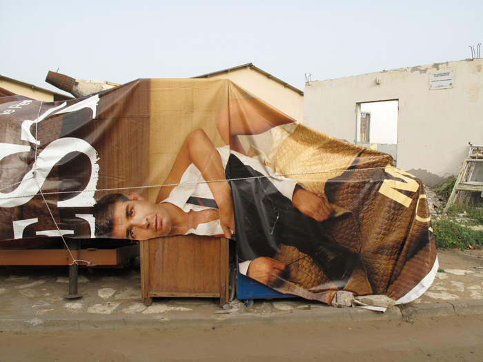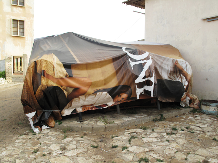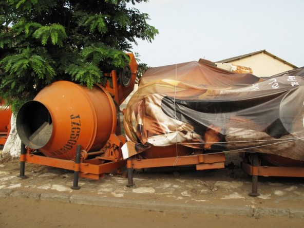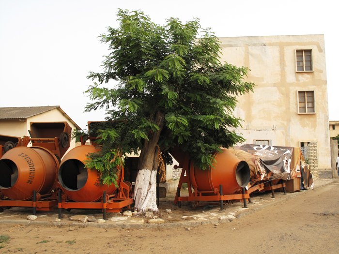 In this technical Lycee in Dakar, large scale Armani advertisements shipped from Europe have been turned into protective tarpaulin against sun and rain for industrial equipements like cement mixers.