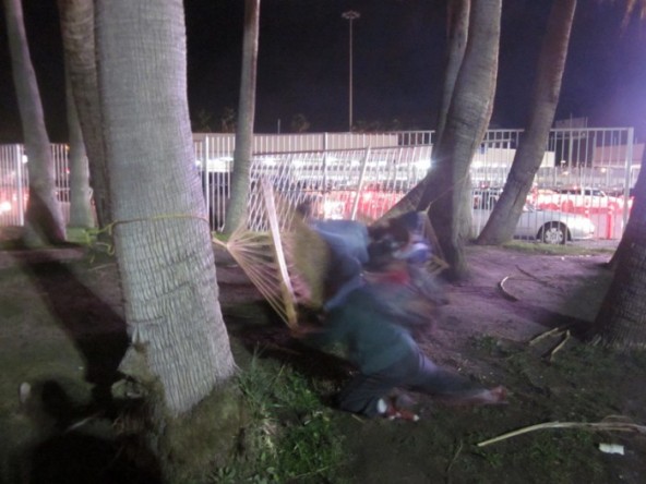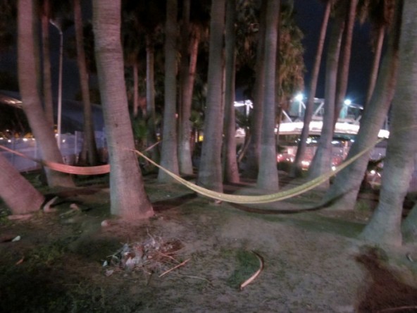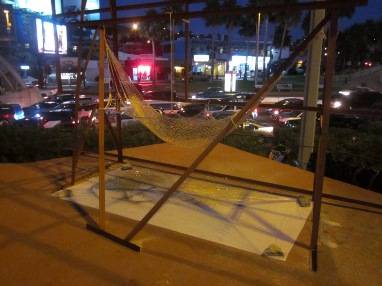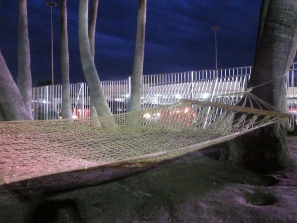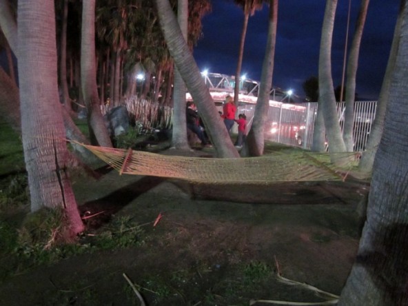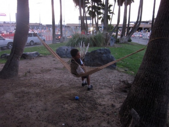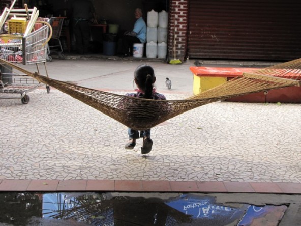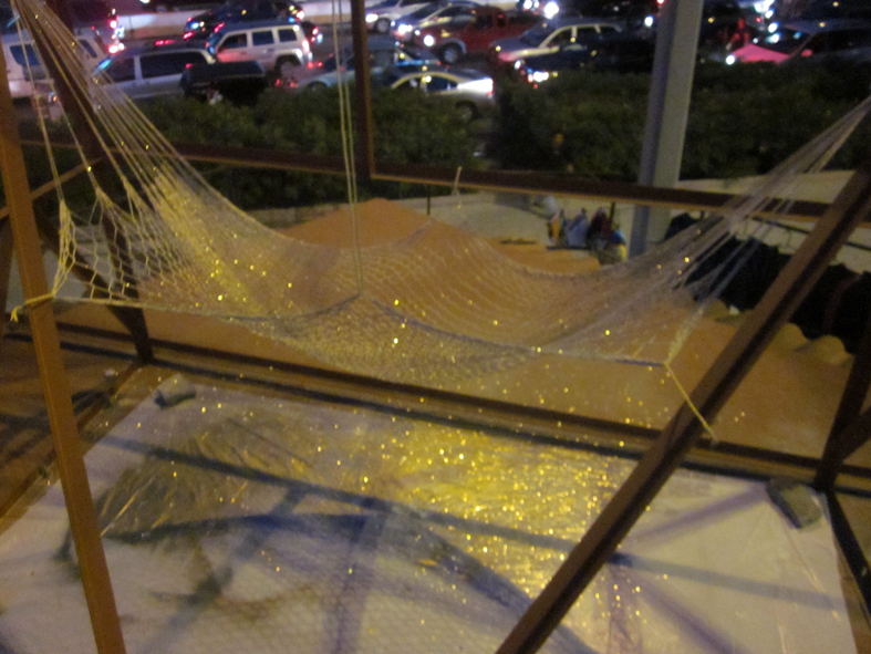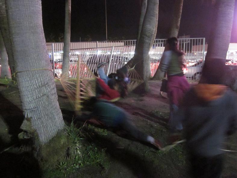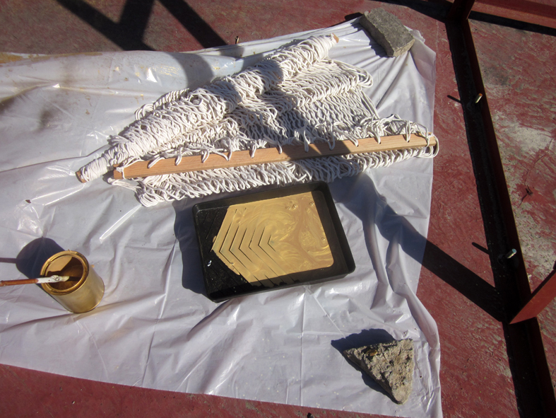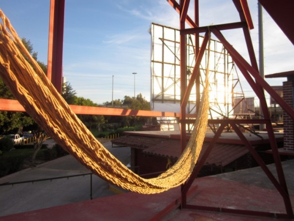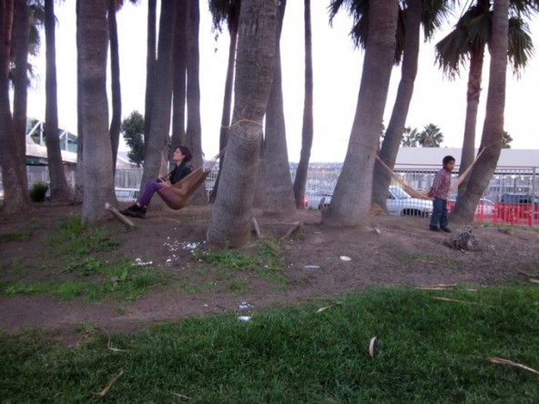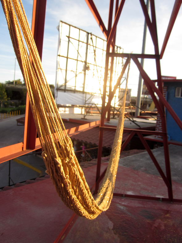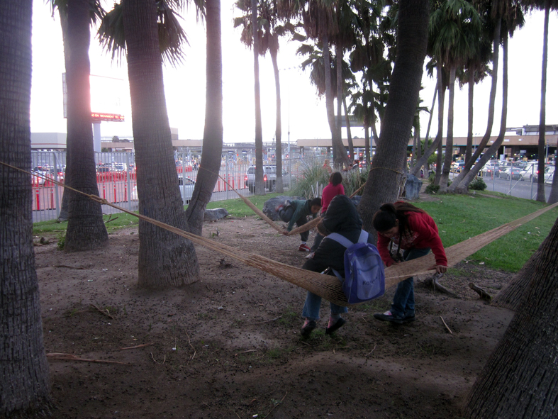 ACTION 5 : des hamacs vendus dans le marché sont teints en or et installés dans un espace résiduel (une zone de non-droit, officiellement interdite d'accès) situé entre plusieurs voies de circulation offrant un rare lieu de tranquillité et de nature à quelques mètres de la frontière.