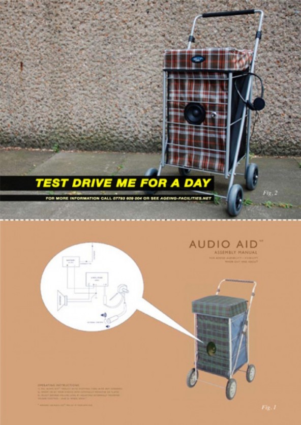 Audio AidNR Audio AidNR is a prototype device produced by Ageing Facilities* to ‘expand elderly audibility in public space’. It takes the generic Sholley® trolley as a cultural symbol of failing mobility in older age and adapts it into a mobile device for the audible reclamation of public space. With adjustable volume control and surface-mounted speakers, the adapted Sholley® enables the playful re-appropriation of urban space through sound while subverting standard perceptions of (proper) generational behaviour in public. Read more - Heteropolis book