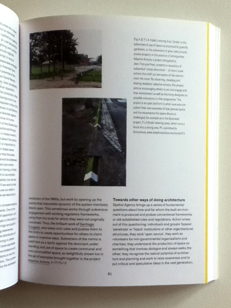 Spatial Agency: Other Ways of Doing Architecture published by Routledge, co-authored by Nishat Awan, Tatjana Schneider, and Jeremy Till is now available here. The book has a selection of the examples on this website, introduced by four extended essays that explain the what, why, where and how of Spatial Agency, providing a theoretical and practical grounding to the subject, and giving pointers as to how to enact Spatial Agency. It is the first time that such a collection of alternative approaches to architectural production have been brought together in one place. The book is intended as a useful and inspiring road map for anyone looking for other ways to deploy architectural intelligence.